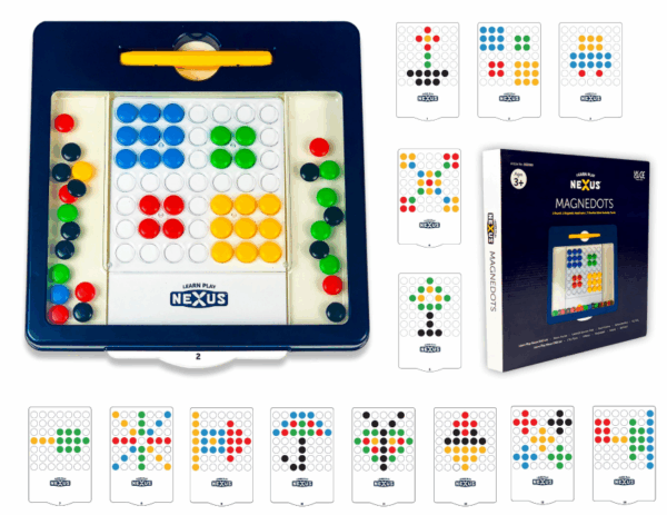 Komplet vsebuje 6 magnetnih tablic v katere lahko vstavite naloge z vzorci. Vsaka tablica ima priloženo 7 obojestranskih kartic z nalogami (ki se vstavijo v tablico) in magnetno držalo, ki se vpne v tablico.